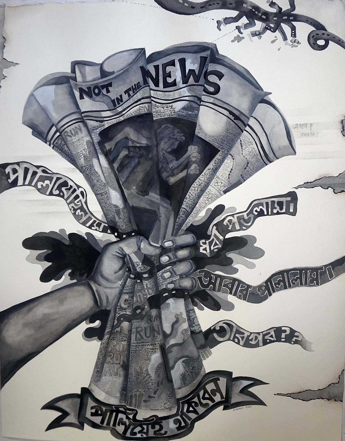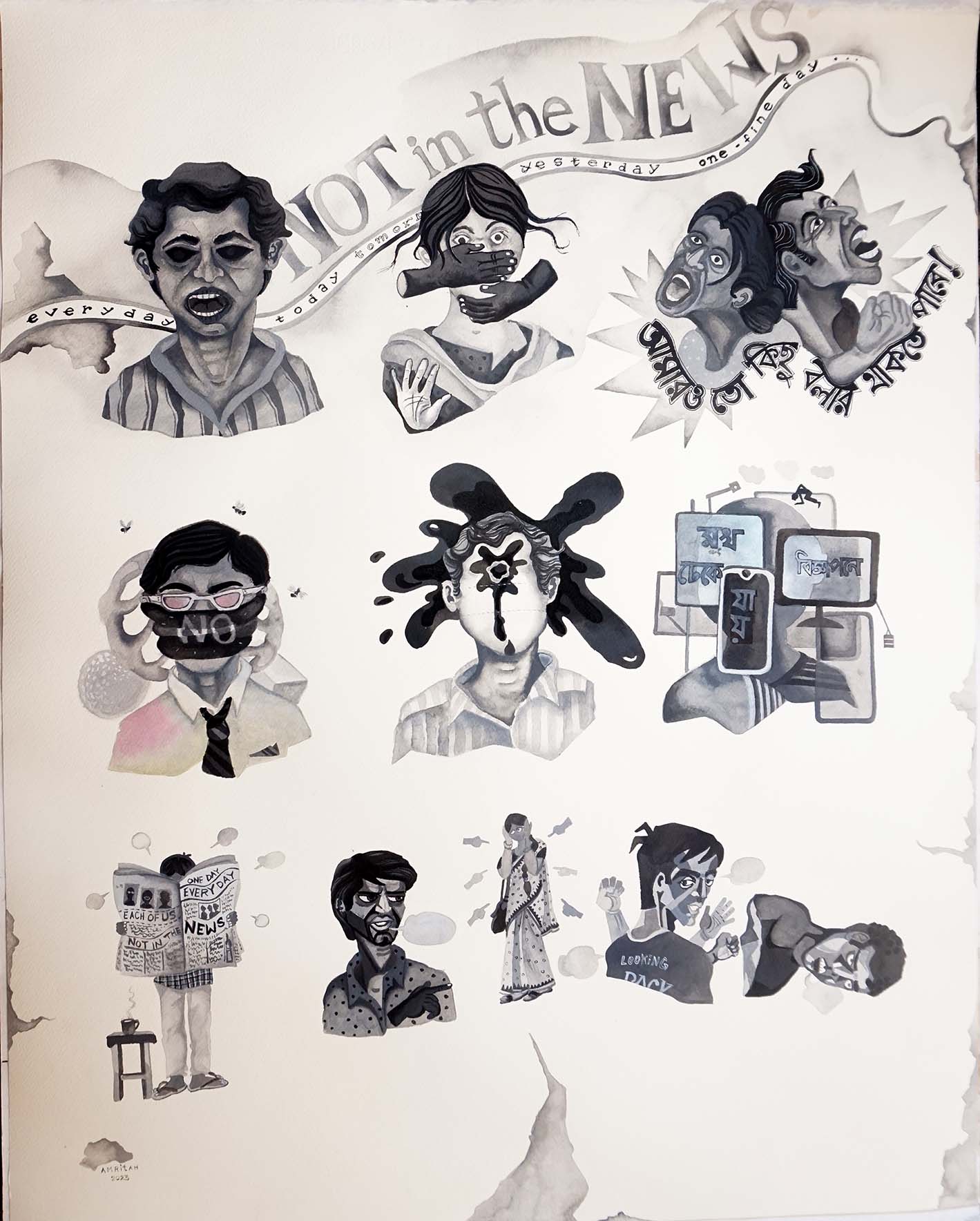 Medium: Drawing, watercolor, pen, collage, etching, aquatint, collograph, woodblock printing, gold and palladium leaf on Japanese Kozo and Arches paper